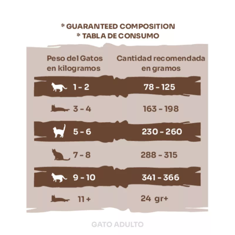 Carne de pollo hidrolizada, agua,hígado de pollo hidrolizado, harina de arroz, arroz quebrado, hemoglobina en polvo hidrolizada, pollo deshidratado hidrolizado, semillas de lino, zeolita, polidextrosa, cloruro de potasio, carbonato de calcio, bicarbonato de sodio, colágeno hidrolizado, cloruro de colina, DL-metionina, sal común, silimarina (cardo mariano), vitaminas (C, E,A,D3,tiamina, riboflavina, piridoxina, B12), minerales (sulfato ferroso, sulfato de cobre, sulfato de magnesio, oxido de zinc, yodato de calcio, selenito de sodio), L-taurina.