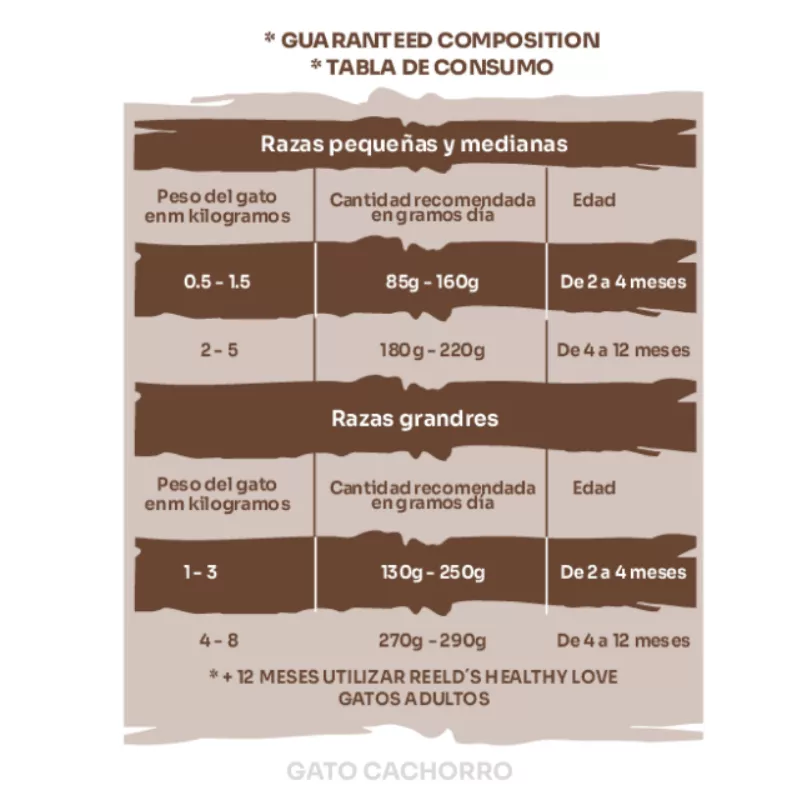 Carne de pollo hidrolizada, agua, hidrolizado de hígado de pollo, harina de arroz, arroz quebrado, arveja seca, hemoglobina en polvo hidrolizada, pollo deshidratado hidrolizada, semillas de lino, zeolita, polidextrosa, cloruro de potasio, carbonato de calcio, bicarbonato de sodio, colágeno hidrolizado, cloruro de colina, L-lisina, DL-metionina, sal común, silimarina (cardo mariano), vitaminas (C, E,A,D3,tiamina, riboflavina, piridoxina, B12), minerales (sulfato ferroso, sulfato de cobre, sulfato de magnesio, oxido de zinc, yodato de calcio, selenito de sodio), L-taurina.