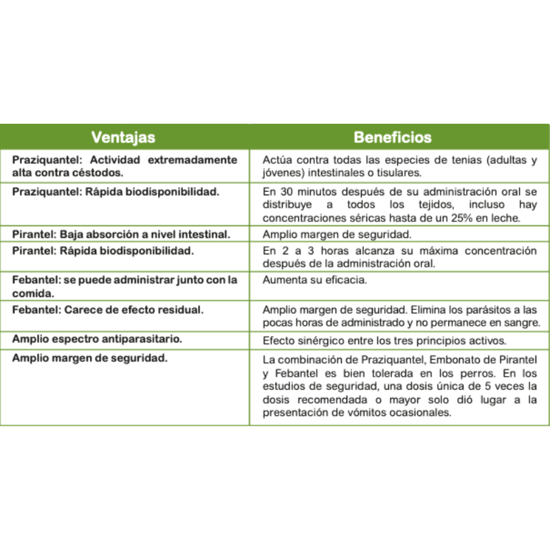 Antiparasitario de amplio espectro a base de Praziquantel (50 mg), Pirantel (50 mg – equivalente a 144 mg de Embonato) y Febantel (150 mg) para el control y tratamiento de nemátodos y céstodos en perros.
